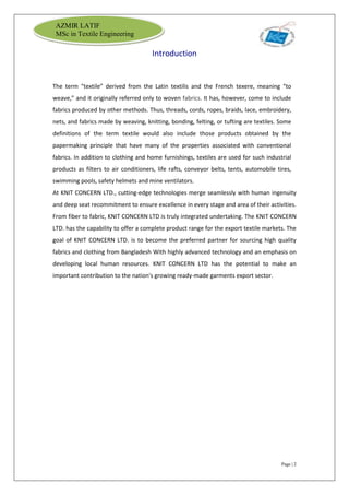 The document is an internship report by Azmir Latif on Knit Concern Ltd., a 100% export-oriented composite knitwear industry in Bangladesh established in 1998. It outlines the company's vision, the organizational structure, and the production processes, highlighting its capabilities in producing high-quality knit fabrics and garments for international markets. The report also details the marketing strategies, buyer relationships, and various operational departments within the factory.