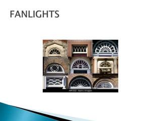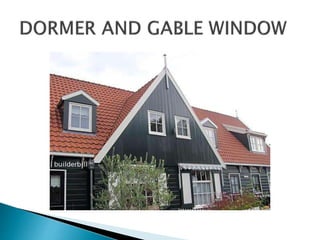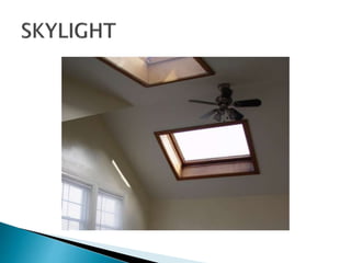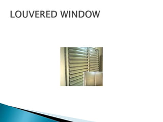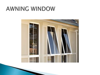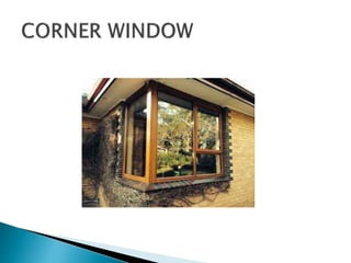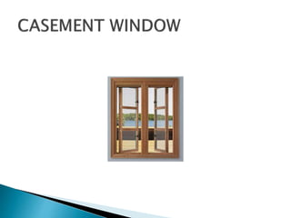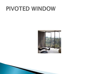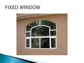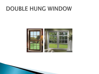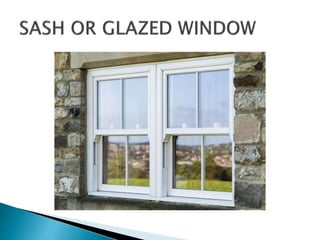 The document defines various types and parts of windows, emphasizing their role in allowing light, air, and sound into spaces. It discusses considerations for window size and placement based on room utility, climate factors, and architectural treatments. Additionally, it details various window types, including fixed, pivoted, double-hung, and sliding windows, along with recommendations for their construction and arrangement for optimum light and ventilation.