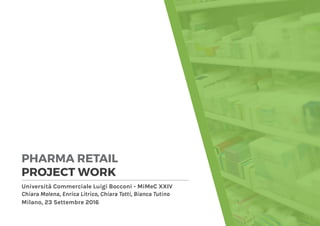 Il progetto analizza il mercato farmaceutico italiano, evidenziando che le farmacie indipendenti e le catene non mostrano differenze sostanziali nell'assortimento di dermocosmesi e nutriceutica. Solo il 20% delle farmacie si distingue cercando assortimenti di nicchia, mentre il restanti 50% offre prodotti plurispecializzati. La fidelizzazione della clientela è legata all'offerta di servizi personalizzati e alla qualità del visual merchandising.