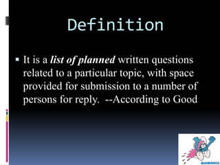 The document defines a questionnaire as a list of written questions related to a topic that is distributed to respondents to answer. It provides advantages such as being easy to construct and distribute, responses are easy to tabulate, and respondents can answer freely and accurately. Disadvantages include some respondents not being able to read or write, or not returning the questionnaire. The document outlines steps for constructing a questionnaire, including researching the topic, drafting questions, editing, pretesting, and finalizing the questionnaire. It also describes different types of questionnaire questions.