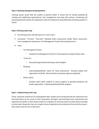 The document describes an action research project that involved tutoring a student with ADHD and organizational issues over 6 sessions. Data was collected through assessments of the student's study habits, binder organization, and time management. Tutoring focused on introducing organizational routines and time management tools. Post-assessments showed the student's performance and organization improved, and their confidence and grades increased as well. The researcher concluded that establishing routines helped the student study more efficiently.
