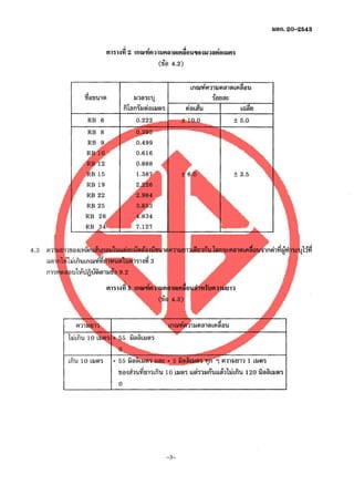 ตารางที่ 3 ช่วงระหว่างบัง ส่วนสูงของบัง และความกว้างของครีบหรือช่องว่าง ้ ้ (ข้อ 4.3) หน่วยเป็นมิลลิเมตร ผลรวมของความกวางของ ชื่อขนาด ชวงระหวางบั้ง สวนสูงของบั้ง ครีบหรือชองวาง สูงสุด ตํ่าสุด สูงสุด สูงสุด DB 6 4.2 0.2 0.5 4.7 DB 8 5.6 0.3 0.6 6.3 DB 10 7.0 0.4 0.8 7.9 DB 12 8.4 0.5 1.0 9.4 DB 16 11.2 0.7 1.4 12.6 DB 20 14.0 1.0 2.0 15.7 DB 22 15.4 1.1 2.2 17.3 DB 25 17.5 1.3 2.6 19.7 DB 28 19.6 1.4 2.8 22.0 DB 32 22.4 1.6 3.2 25.2 DB 36 25.2 1.8 3.6 28.3 DB 40 28.0 2.0 4.0 31.4 4.4 ความยาวของเหล็กข้ออ้อยในแต่ละมัดต้องมีขนาดความยาวเดียวกัน โดยจะคลาดเคลื่อนจากค่าที่ผู้ทำ ระบุไว้ทฉลากได้ไม่เกินเกณฑ์ทกำหนดในตารางที่ 4 ่ี ่ี การทดสอบให้ปฏิบตตามข้อ 9.3 ั ิ ตารางที่ 4 เกณฑ์ความคลาดเคลือนสำหรับความยาว (เฉพาะกรณีเป็นมัด) ่ (ข้อ 4.4) ความยาว เกณฑความคลาดเคลื่อน ไมเกิน 10 เมตร + 55 มิลลิเมตร 0 เกิน 10 เมตร + 55 มิลลิเมตร และ + 5 มิลลิเมตร ทุก ๆ ความยาว 1 เมตร ของสวนที่ยาวเกิน 10 เมตร แตรวมกันแลวไมเกิน 120 มิลลิเมตร 0 –4–