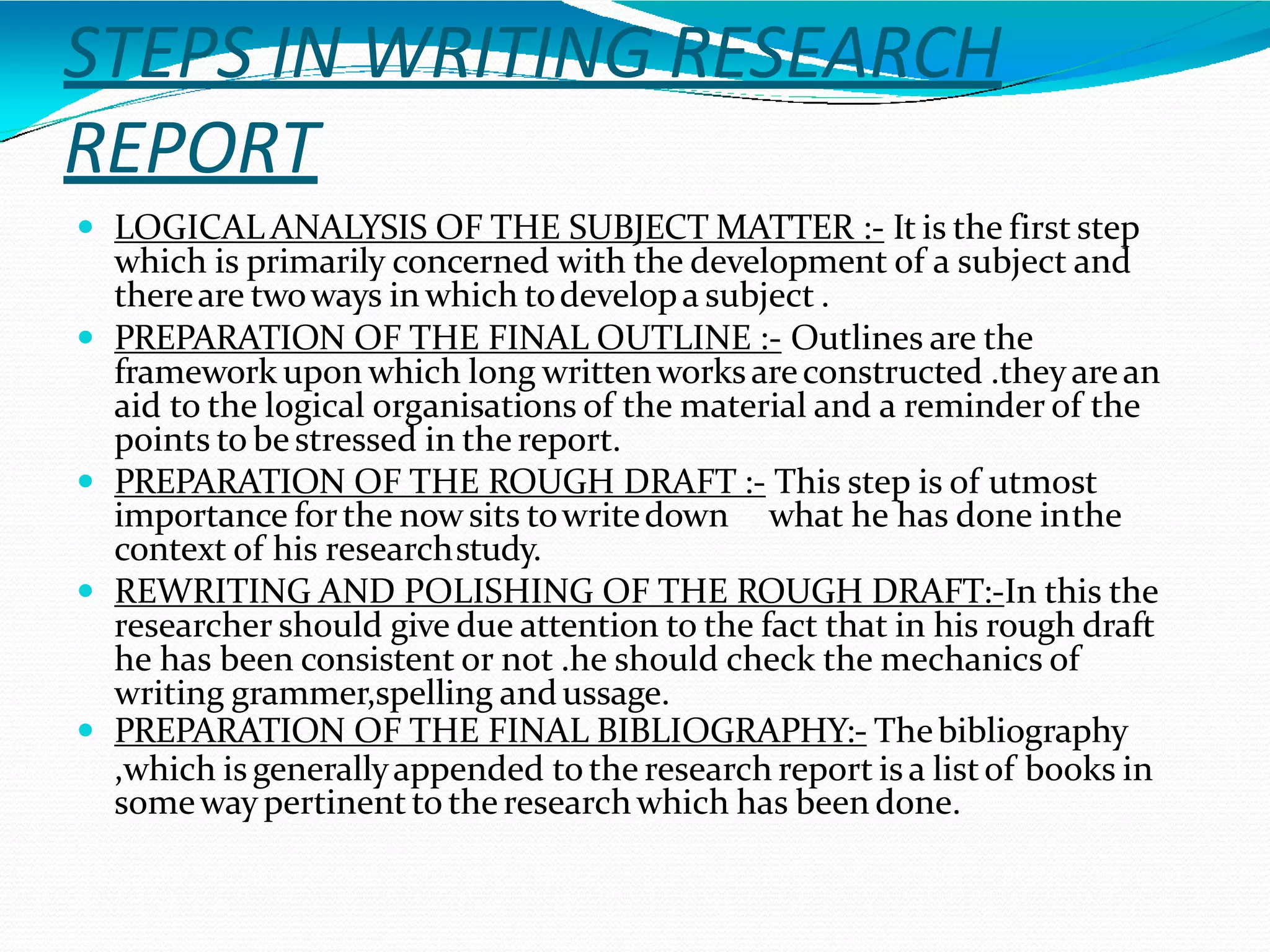 The document outlines the key steps in writing a research report: 1) logically analyzing the subject matter and developing the topic in two ways, 2) preparing a final outline to provide the framework and organization of the material, and 3) drafting the report, rewriting and polishing it for consistency in grammar, spelling, and style, and preparing a final bibliography of relevant sources.