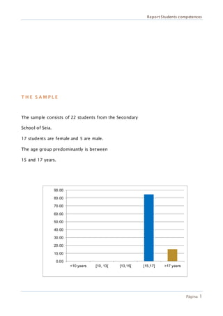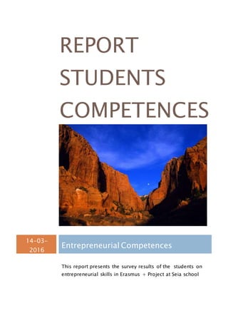 This report summarizes the results of a survey of 22 Portuguese students on their entrepreneurial competencies and skills. It finds that while most students recognize personal strengths like thinking about the future, around half do not see themselves as potential entrepreneurs. The students communicate well in groups and online but are less confident in persuasion. Most see opportunities but have difficulties implementing ideas or solving problems. Students also demonstrate insecurity about risks and responsibilities when projects become difficult. However, they believe this education project will help develop business skills and many would like to start small businesses.