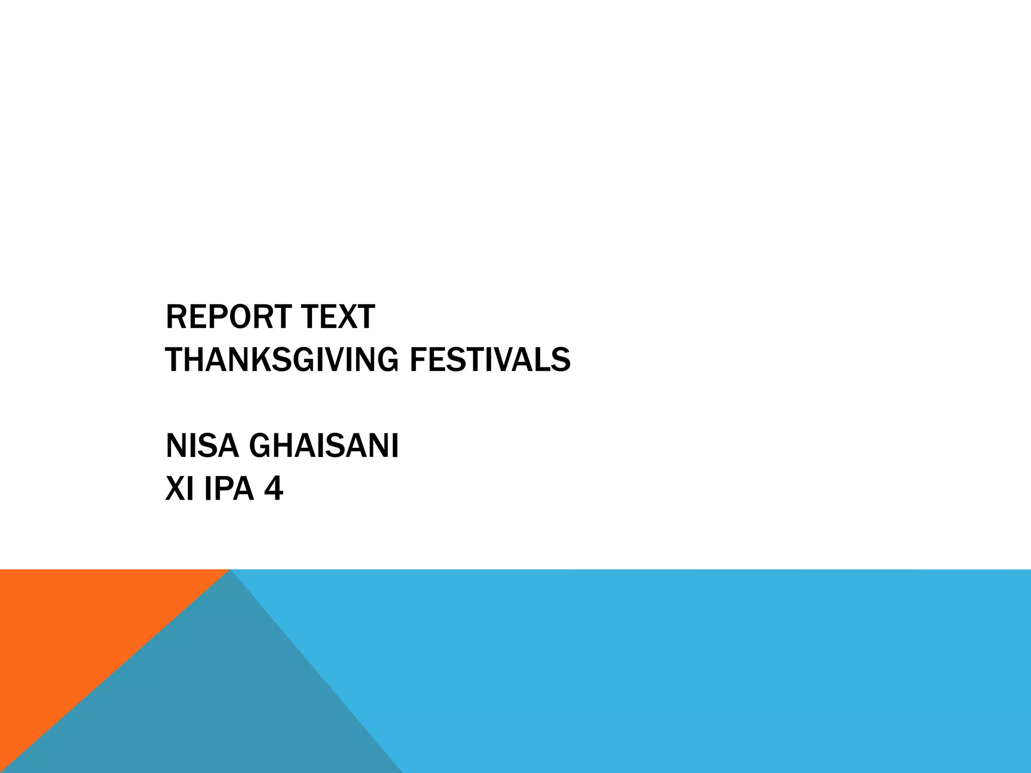 The document discusses the definition and generic structure of report texts. It then provides details about Thanksgiving, including that: 1) It is usually celebrated in late autumn to give thanks for harvest and survival; 2) It originated from celebrations in New England and to thank God for survival in the new land; 3) It is now celebrated in the United States and Canada on the fourth Thursday of November and second Monday of October respectively. Families gather and turkey is the main dish.