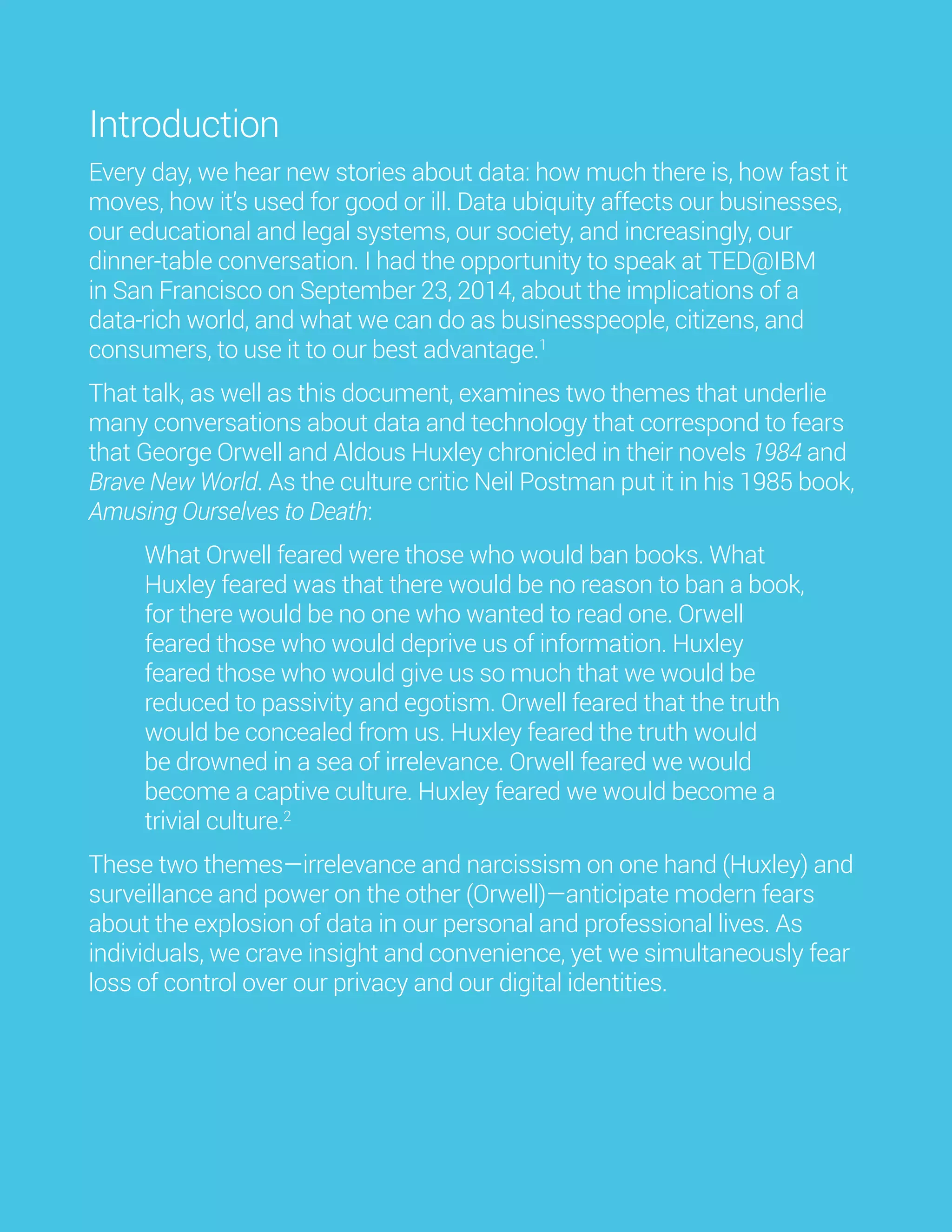 The document discusses the challenges and implications of big data, emphasizing the need to extract valuable insights while maintaining trust among various stakeholders. It highlights concerns rooted in Orwellian and Huxleyan fears regarding information control and societal engagement in a data-rich environment. Ultimately, it calls for organizations to thoughtfully analyze and communicate their roles in managing data to achieve sustainable advantages.