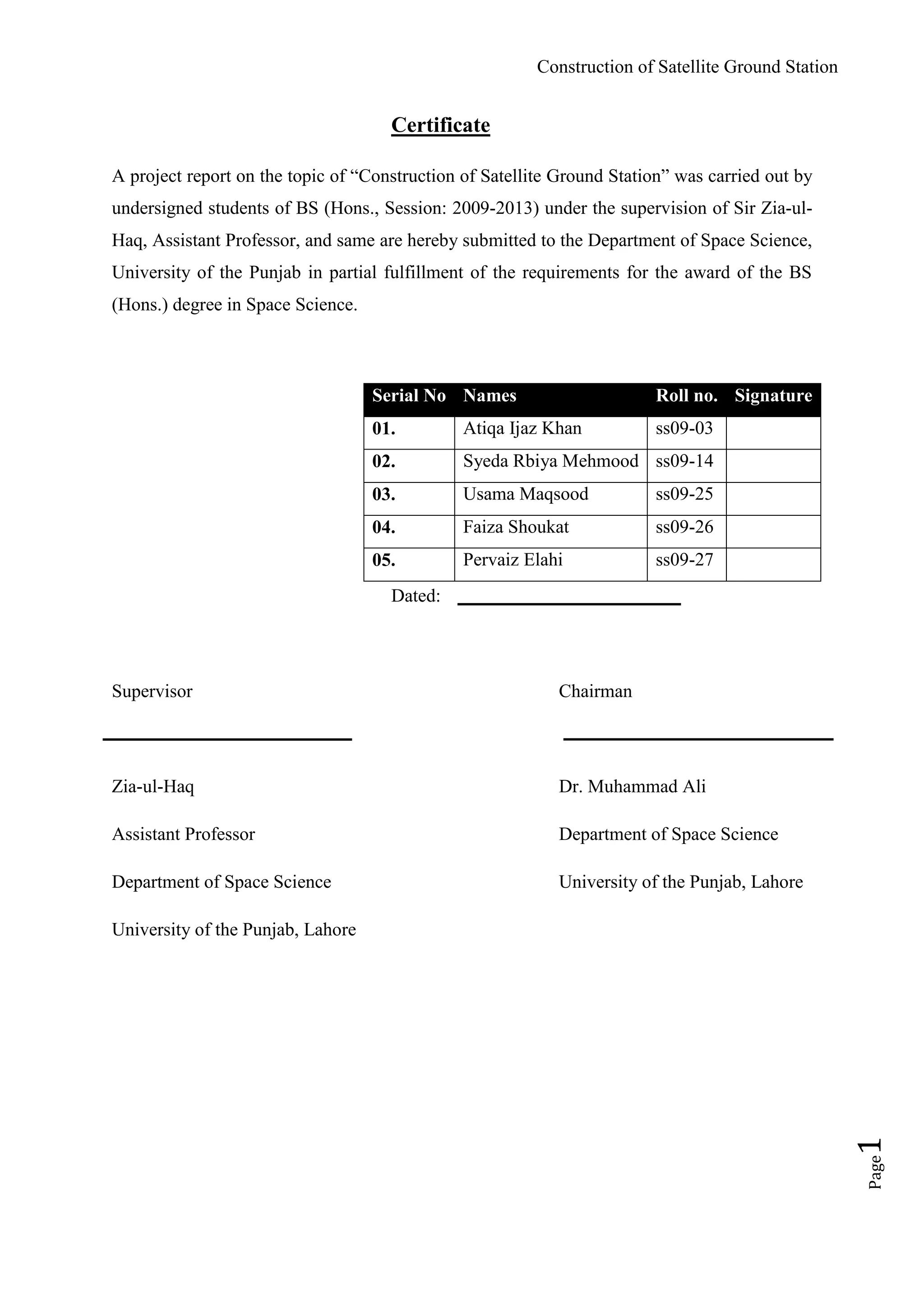 This document presents a project report on the construction of a satellite ground station by students at the University of the Punjab, highlighting the significance of automatic picture transmission (APT) in receiving satellite images for educational, scientific, and military purposes. It details various types of satellites, their components, and the procedures for building a ground station, including the necessary software and hardware. The report is submitted in fulfillment of the requirements for a Bachelor of Science degree in Space Science.