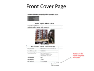 The document provides guidance on writing expert reports. It emphasizes that reports should be concise, well-organized, and focus on the key issues. Reports should include an assessment of the instructions, qualifications of the expert, observations and documentation of any defects, opinions on the cause of defects and compliance with relevant standards, scope and costing of recommended repairs. Photographic evidence should be annotated to clearly illustrate issues. Overall, the document stresses the importance of thorough investigation and presentation of reasoning to establish credibility as an expert witness.