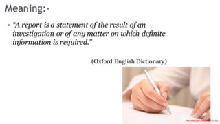 This document provides guidance on writing reports for university coursework. It discusses the purposes and types of reports, outlines the typical structure and steps in report writing, and covers aspects like formatting, citations, and mechanics. The key points covered include understanding the objectives of a report, planning and outlining, collecting and organizing information, using an appropriate writing style, and laying out the report properly. The document also describes sections like the title page, table of contents, introduction, literature review, methodology, results, discussion, conclusion, and references.
