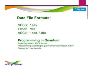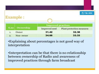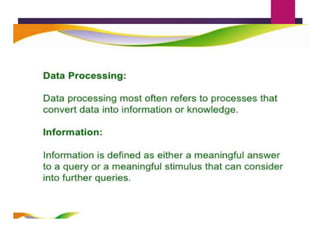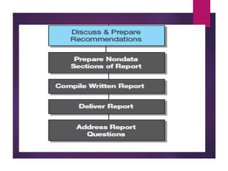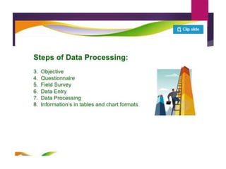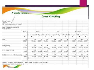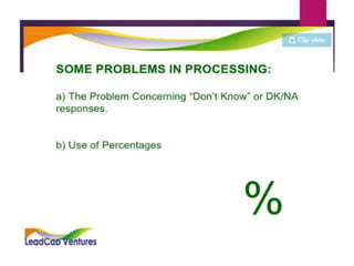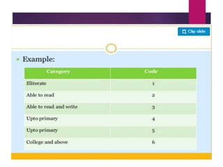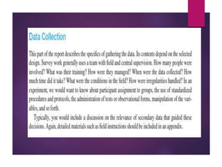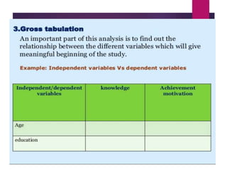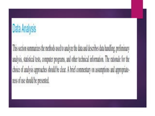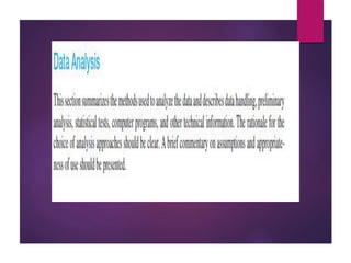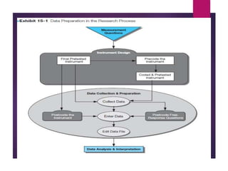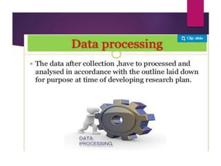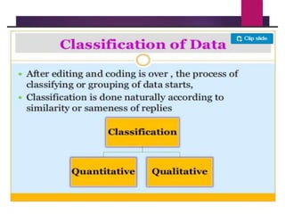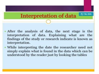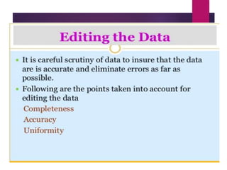 This document discusses data analysis and report writing. It focuses on the initial phases of data analysis: data preparation and description. This includes editing data to ensure accuracy, coding responses numerically for analysis, and creating descriptive statistics. The document outlines best practices for editing data at both the field and central levels. Coding involves assigning numeric codes to categorical responses so the data can be analyzed efficiently. Proper interpretation is also discussed as key to drawing meaningful inferences from the analysis and establishing explanatory concepts and continuity in research. Techniques like considering all relevant factors and consulting experts can help ensure accurate interpretation.