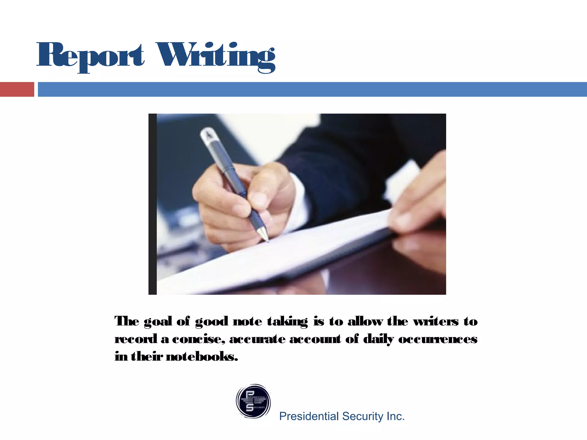 The document outlines the importance of meticulous note-taking and report writing for personnel at Presidential Security Inc. It emphasizes that notes should be detailed, organized chronologically, and free of personal opinions, as they serve as both a memory aid and a basis for formal reports. Additionally, it highlights the key content that reports must cover, including the who, what, when, where, why, and how of incidents, ensuring clarity and accuracy for potential court testimonies.
