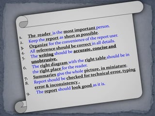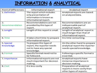 The document outlines the structure and types of reports, emphasizing that they serve to communicate organized information to specific audiences. It details the differences between routine and special reports, as well as between oral and written formats, highlighting key elements such as content, analysis, and recommendations. Additionally, it provides guidelines for drafting reports, including audience analysis and revising techniques to enhance clarity and purpose.