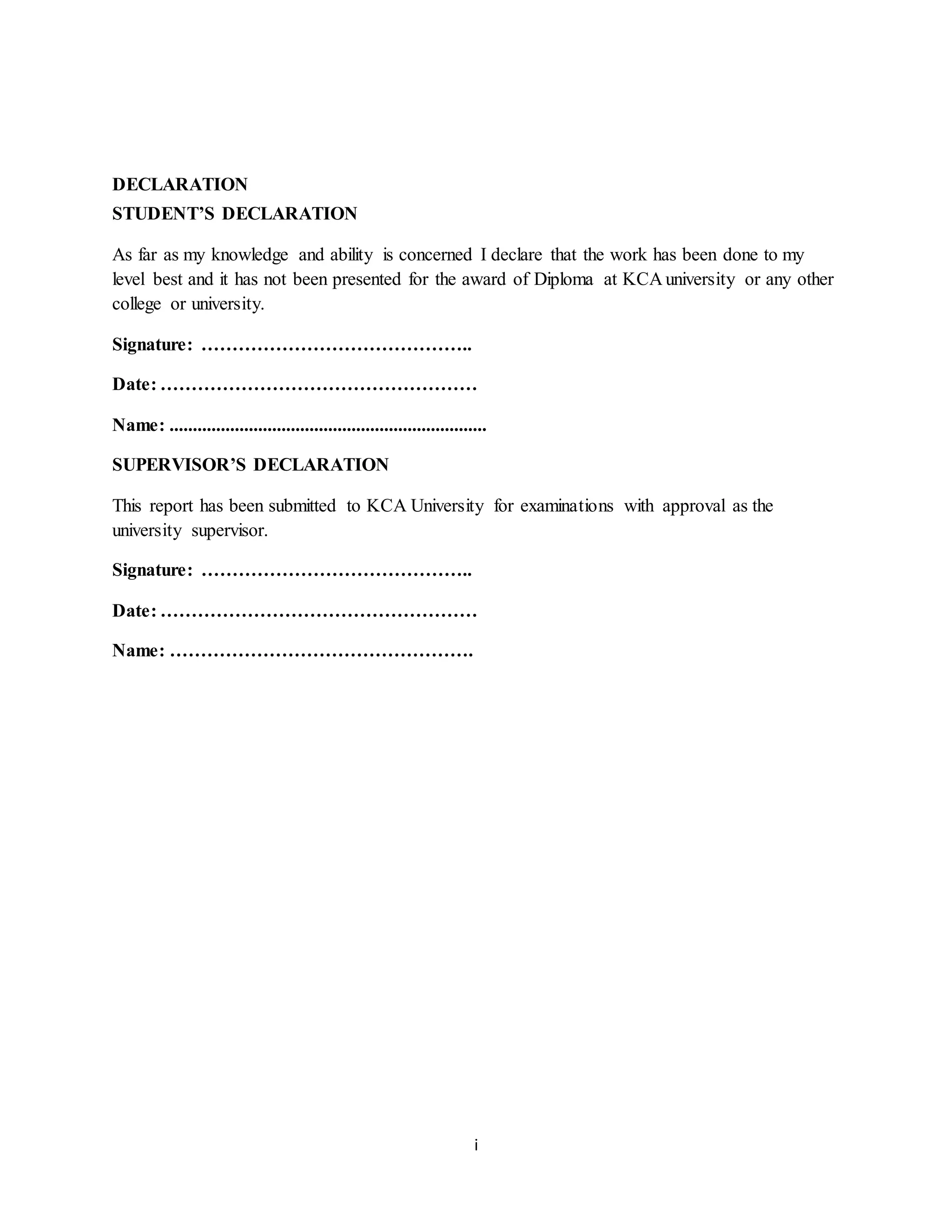 The document contains a student's declaration stating that the work presented is their own and has not been submitted elsewhere. It also contains a supervisor's declaration approving the report for examination. The project aims to develop an efficient fleet management system for Crown Bus Company to track vehicle and employee information in a computerized manner. It will address current issues like difficulty keeping track of vehicle repair and maintenance information. The system will be developed using MySQL, PHP, HTML and CSS on a WAMP server.