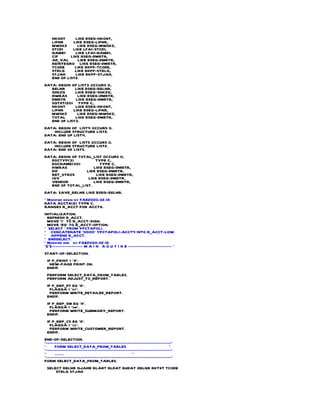 This program extracts documents from an SAP R/3 accounting module to generate three reports for purchase reports required by Peruvian law. It selects documents between a start and end date that have tax codes starting with 'C' or 'R' and writes them to the appropriate reports based on selection criteria. One report is for import certificates and has a different format. It performs calculations and adjustments to the data to populate the required fields for each report.