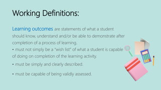 The document discusses aligning learning outcomes, teaching strategies, and assessments. It defines learning outcomes as statements of what students should know and be able to do after learning. Learning activities involve students solving tasks to learn. There are three types of assessment: assessment for learning uses formative feedback, assessment as learning involves student self-reflection, and assessment of learning makes summative judgments on achievement. Proper alignment involves defining outcomes, choosing teaching methods to achieve them, and assessing if they were achieved.