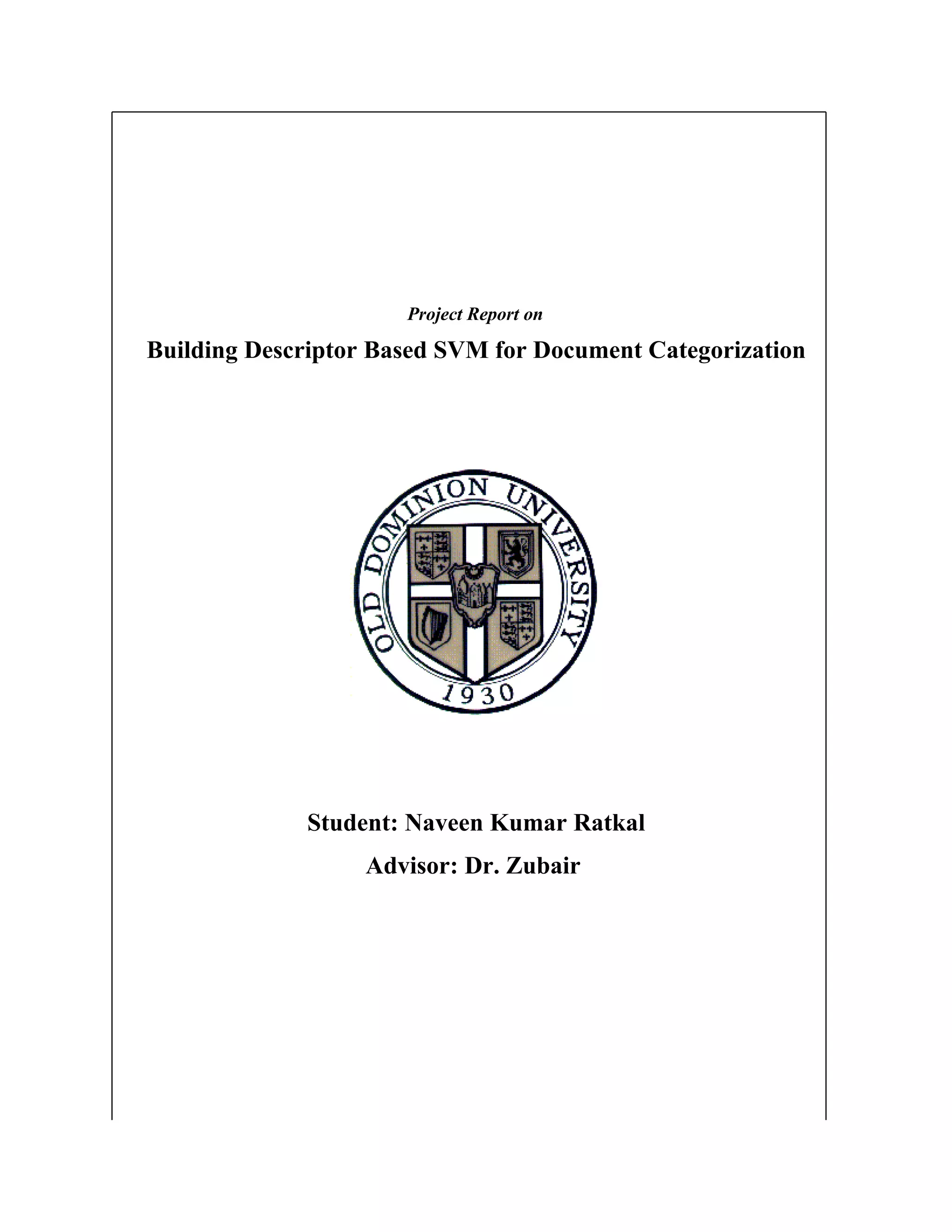 This document provides a project report on building a descriptor-based support vector machine (SVM) for document categorization. It introduces SVMs and discusses how they were implemented for this project, including transforming data, scaling, using an RBF kernel, and training and assigning documents. The architecture of the SVM-based system is described, including training SVMs on descriptors and assigning descriptors to new documents. Experiments were conducted on a testbed using 5 descriptors, and recall, precision, and correct rate metrics were used to evaluate the results. In conclusion, the document demonstrates applying SVMs to automatically categorize documents based on their descriptors.