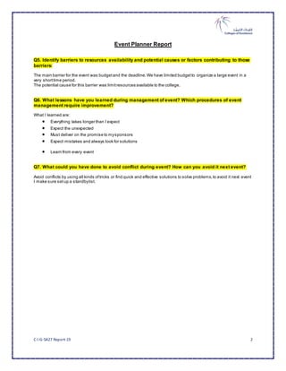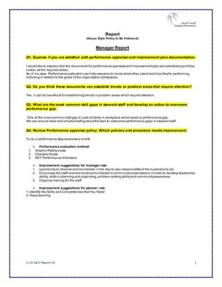 The document discusses performance appraisal and improvement plans. It expresses satisfaction with the current documents which cover all required areas. It notes performance evaluations can help establish how employees are performing and in relation to organizational goals. It also notes the documents can help establish trends or problem areas needing attention. One common skill gap identified is a lack of clarity in the workplace, and ensuring clear task briefings is suggested to overcome performance gaps. The document reviews the performance appraisal policy and lists evaluation methods and suggestions for improving manager and planner roles. Barriers to event resources like limited budget and time are identified. Lessons learned from event management included allowing more time than expected and being prepared for mistakes and unexpected issues. Suggestions to avoid conflicts in