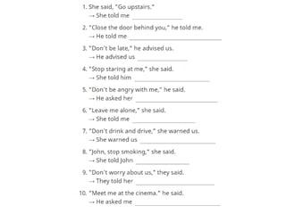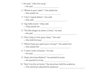 The document provides information about reported speech (also known as indirect speech). It explains what reported speech is, how to use it, and the tense changes that occur when changing from direct to reported speech. Examples are given of direct and reported speech for statements, questions, and commands. The summary is: