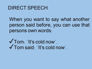 The document discusses different ways to report what someone else has said, including using direct versus indirect speech. It explains how to change verbs, pronouns, places and times when converting direct speech to indirect speech. Reporting questions and requests are also covered, as well as verbs used to report offers, suggestions and other speech acts.