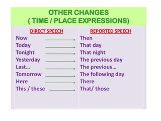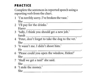 This document discusses the different types of reported sentences: statements, questions, and commands. For statements, it provides examples of how the reported version changes the tense or words like yesterday to the day before. For questions, it explains that yes/no questions and wh- questions are reported using "ask" followed by if for yes/no or the wh- word for wh- questions. Commands are reported using "ask" or "tell" followed by an infinitive clause. It also lists common reporting verbs used to report what someone said or did, like apologize, claim, advise, etc. and whether they take an infinitive clause or -ing form.