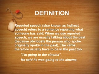 The document discusses the rules for changing direct speech into reported or indirect speech. It explains that verbs must change to past tense, pronouns and place/time references are adjusted, and that reporting verbs like "said" are used to indicate an statement was made indirectly. Indirect questions use "asked" and change word order. Indirect orders/requests use "told" or "asked" followed by an infinitive verb.