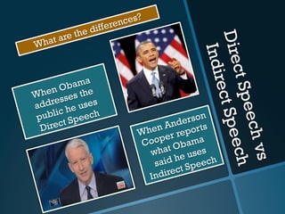 Direct speech refers to quoting someone's exact words, while indirect speech involves reporting what someone said without using their exact words. The key differences are that indirect speech changes pronouns, adverbs of time and place, and verb tenses. For example, direct speech would be "I am working for my country" while the indirect version reported by Anderson Cooper would be "He said that he was working for his country." The document provides additional examples of how direct speech converts to indirect speech by changing verb tenses and other elements.