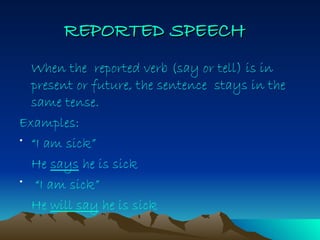The document discusses reported or indirect speech. It explains that when the reported verb is in the present or future tense, the reported sentence remains in the same tense, but when the reported verb is in the past tense, there are changes to the reported sentence tenses according to rules provided. Examples are given to illustrate these tense changes when converting direct to reported speech. Finally, some exercises are provided to practice reported speech.