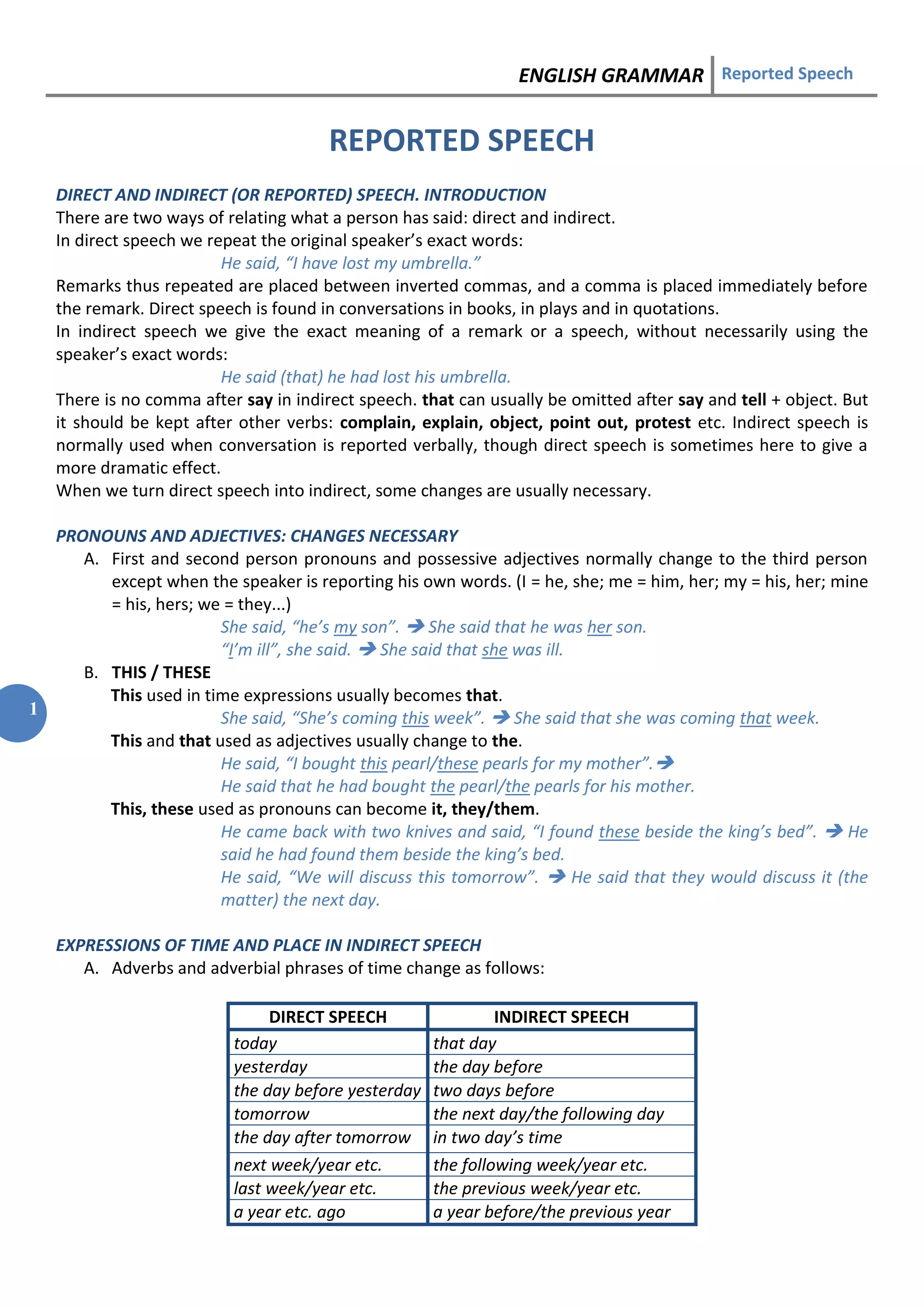 This document discusses direct and indirect (reported) speech in English grammar. It provides examples of how to change direct speech into indirect speech, including changing pronouns, adverbs of time and place, and verb tenses. It also covers reporting statements, questions, commands, requests, exclamations and other speech types in indirect speech. The document is intended as a guide for properly transforming direct quotations into reported speech.