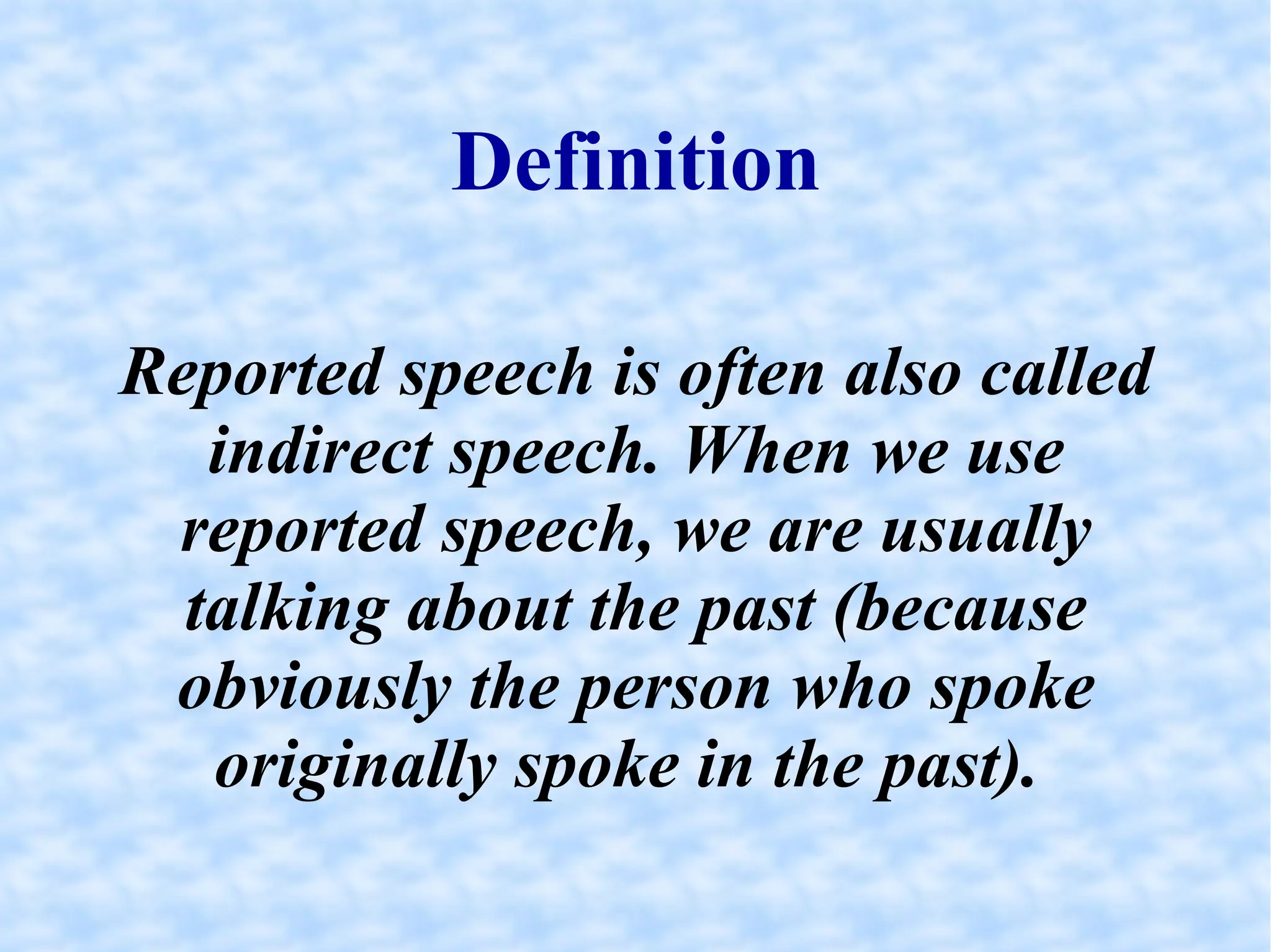 Reported speech is used to report what someone else has said and involves changing the tense of the original statement. For example, direct speech would be "I'm going to the cinema" while reported speech is "He said he was going to the cinema." Verb tenses in reported speech are typically changed to the past tense. The document provides a chart showing how common verb tenses such as present simple change to past simple in reported speech, and includes examples of other verb forms like will changing to would. Time and place references are also changed in reported speech, such as now becoming then.