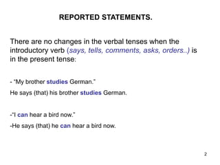 The document discusses how to report speech and questions in indirect or reported speech. When reporting speech or questions, the verb tenses and other elements like pronouns and time expressions are changed depending on whether the introductory verb is in the present or past tense. Verb tenses, time expressions, and pronouns are changed to be consistent with the tense of the introductory verb. Suggestions and orders are also reported using verbs like suggest, order, and by changing the verbs to the infinitive form.