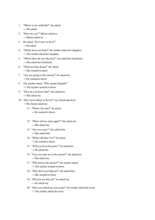 The document provides examples of direct speech and asks to rewrite them in reported speech by changing pronouns, time expressions, and verbs as needed. It provides 20 examples of direct speech and the corresponding reported speech.