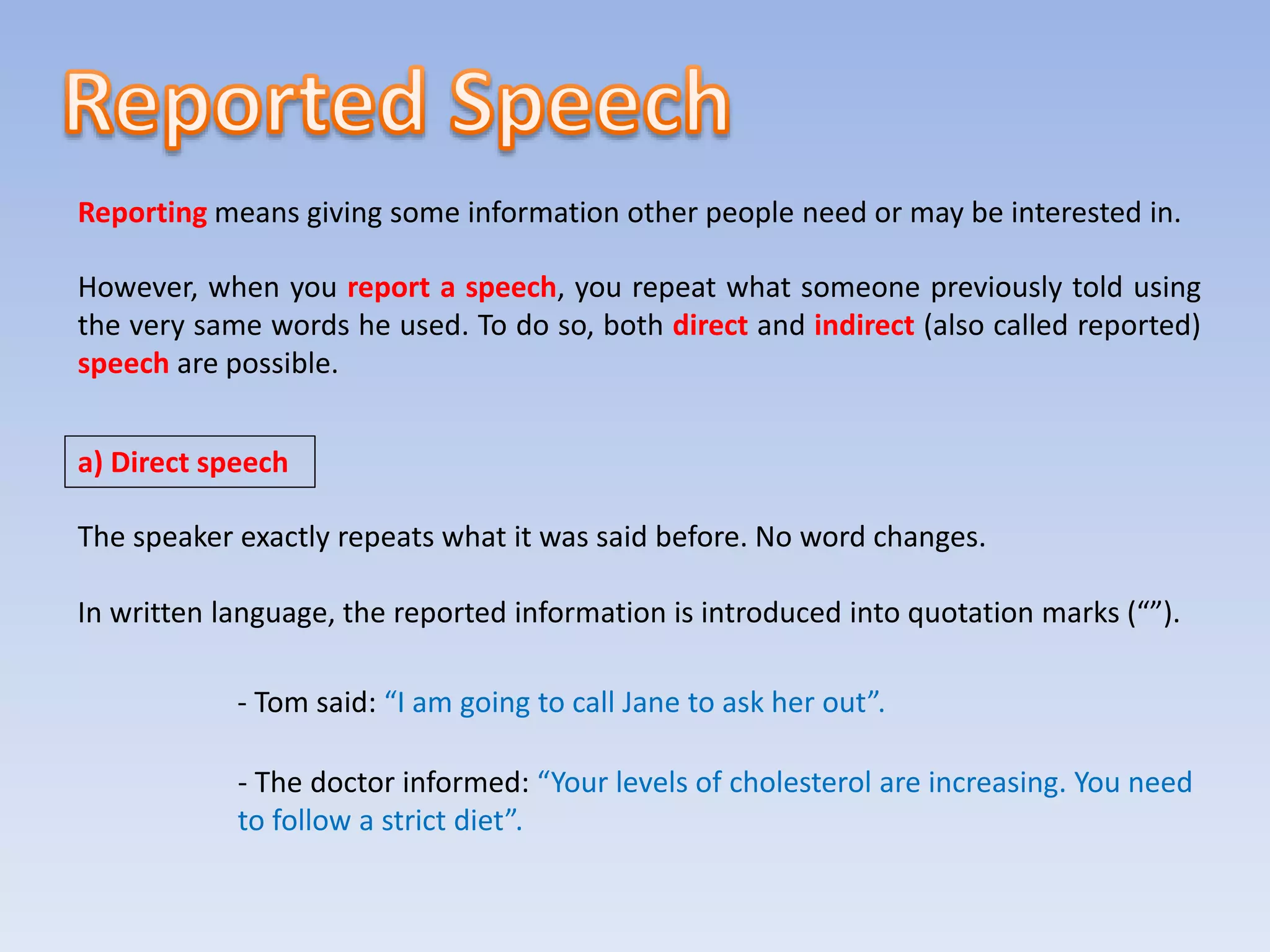 1) Reporting means relaying information that others have said using either direct or indirect speech.
