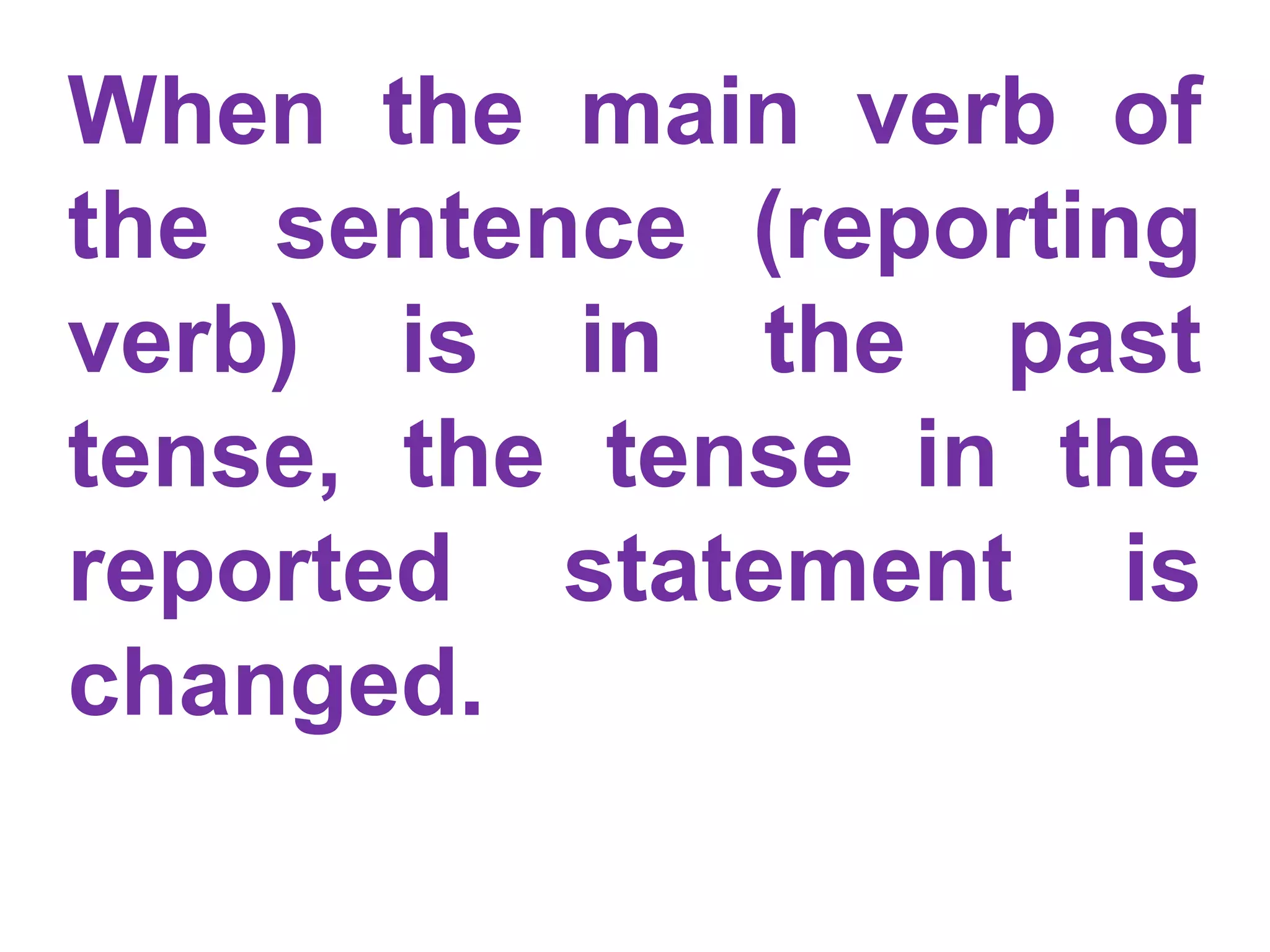 This document explains how to change direct speech into reported speech by modifying verb tenses and other elements like pronouns, adverbs of time and place. When reporting speech, the tense of the verb in the reported clause is usually changed to be one tense back compared to the tense of the reporting verb. Pronouns, adverbs of time and place, and other elements are also typically changed to be consistent with the fact that a past reporting verb is being used to report past speech or a situation.