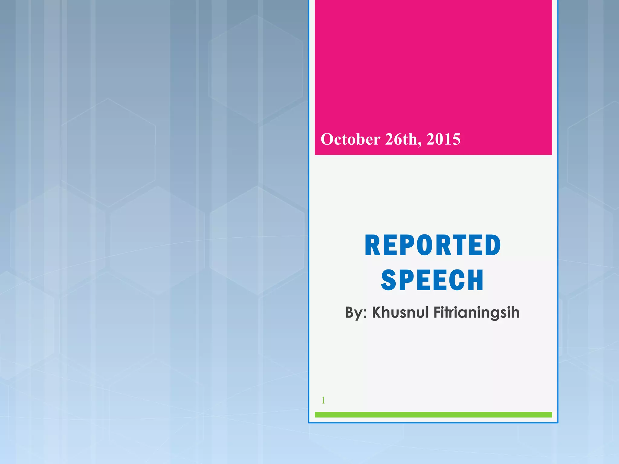 The document discusses reported or indirect speech, which is used to describe what someone said in the past. It explains that in reported speech, pronouns, verbs, adverbs, and time/place expressions are changed compared to direct speech. Examples are provided showing how direct speech like "I am going now" would change to reported speech like "She said that she was going then." The different types of sentences that can be reported - statements, questions, and commands - are also described.
