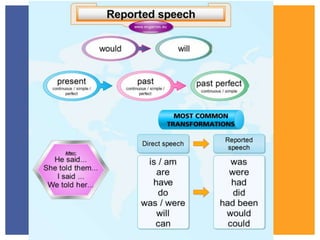 This document provides an overview of English verb tenses and forms, including: the present simple and past simple; present continuous and past continuous; past simple and past perfect; present perfect and past perfect; can and could; will and would; and the differences between saying and telling something. Key verb conjugations and subjects vs objects are also listed.