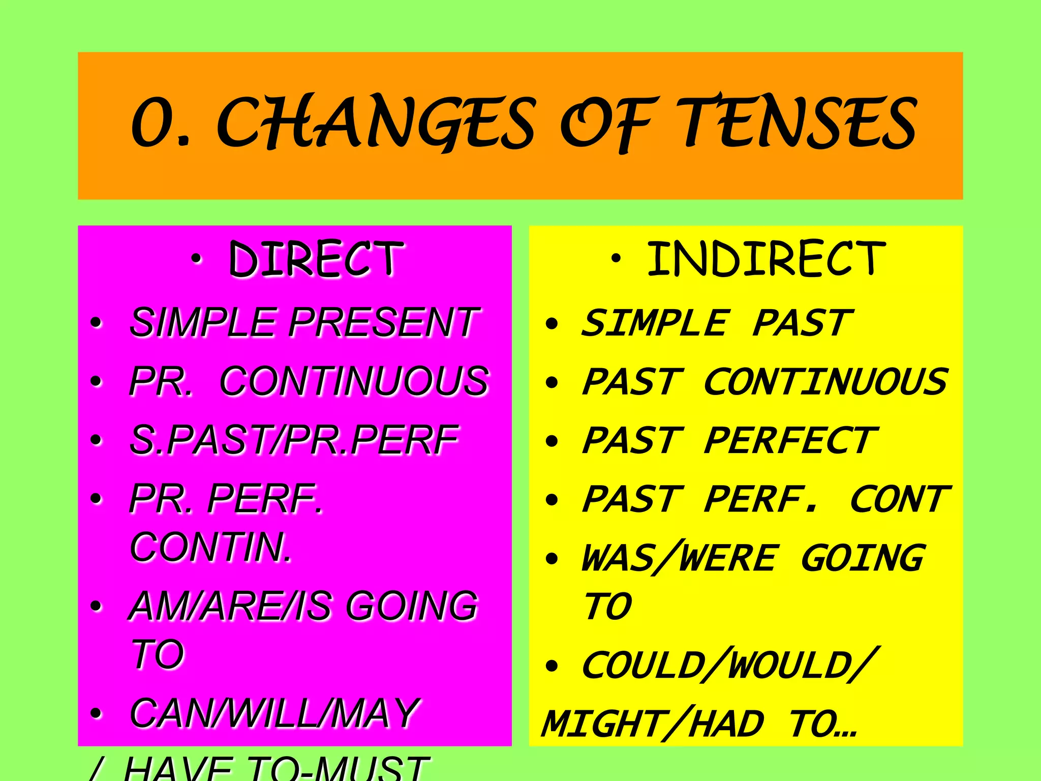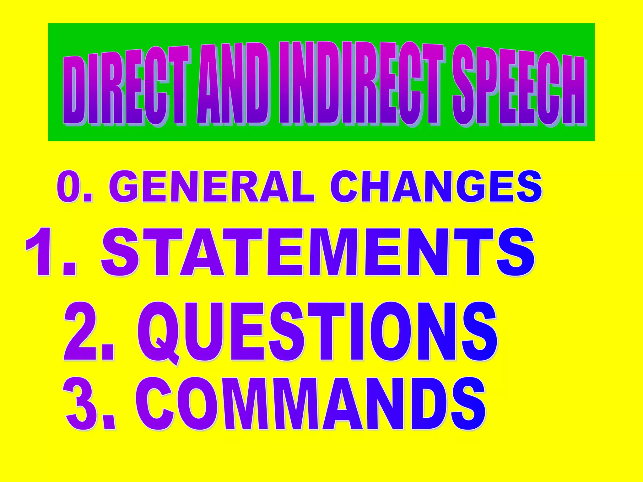 This document discusses the changes that are made when converting direct speech to indirect speech. It covers changes to verb tenses, pronouns, adverbs of time and place, and punctuation. Examples are provided for statements, yes/no questions, Wh- questions, positive commands, and negative commands. The examples show how the direct speech is rewritten in indirect speech based on the rules described. Exercises with additional examples of direct speech are included at the end.