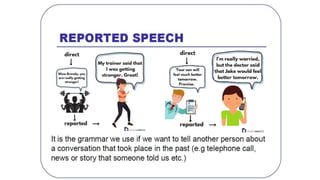 This document discusses how to summarize reported speech in English. It notes that when reporting speech, pronouns and verb tenses change and time words are altered. For example, "I" becomes "he" and "will" becomes "would". Exceptions exist for speech reported very soon after it was said. The verbs "say" and "tell" are used differently in reported speech. "Tell" requires an object while "say" usually does not. Questions are reported without question words or word order changes when summarized.