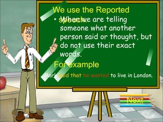 The document discusses reported speech and how it differs from direct speech. It explains that reported speech is used to tell someone what another person said without using their exact words. Key changes in reported speech include removing quotation marks, changing verb tenses and pronouns to reflect a new speaker and time, and altering words referring to places, times, and personal pronouns. The document provides examples of these grammatical changes between direct and reported speech.