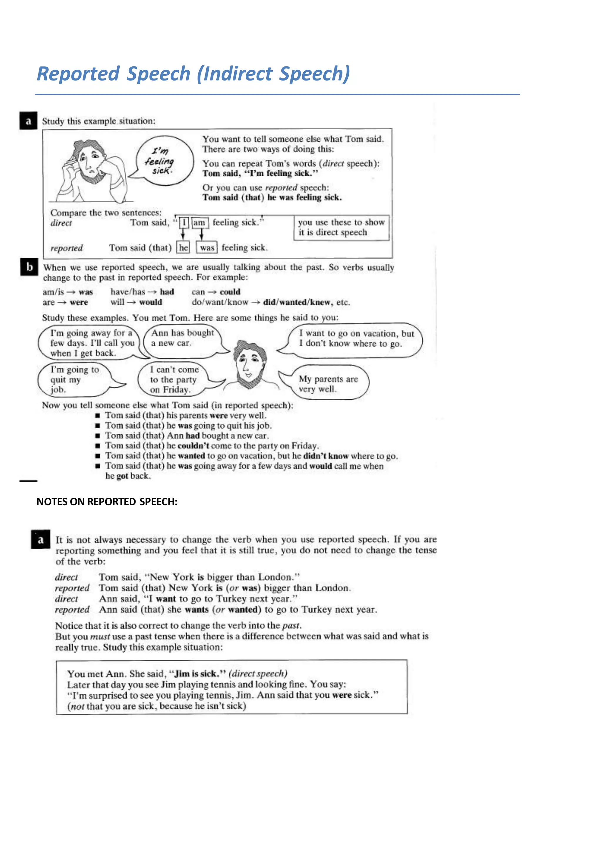 The document summarizes the key rules for changing reported speech based on changes in place, time, and people involved. It provides examples of direct speech and the corresponding reported speech. It also includes a table showing typical changes to time expressions between direct and reported speech, such as "now" becoming "then" and "tomorrow" becoming "today". Exercises are included to practice reported speech rules.