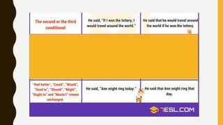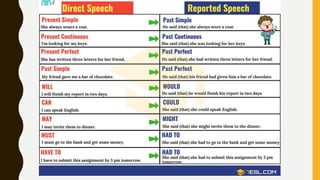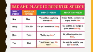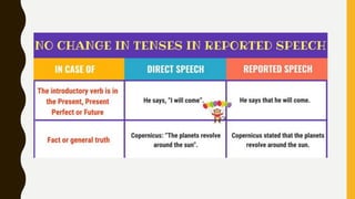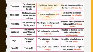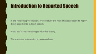 This document provides an overview of reported speech and the main changes needed to convert direct speech into indirect speech. It discusses how to change verbs, pronouns, time/place adverbs, and types of questions like yes/no questions and WH-questions. Examples are given to practice these changes, such as reported statements and questions. The document concludes by noting that while it outlines common rules for reported speech, there are exceptions in real language use.