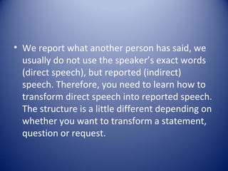 1) Reported or indirect speech is used to report what another person has said without using their exact words. Pronouns, verb tenses, place and time expressions may need to be changed depending on whether a statement is being reported.