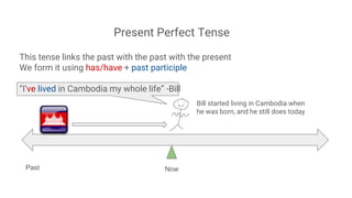 The document discusses using the present perfect and past perfect tenses when reporting what someone else has said. It explains that: 1) When reporting speech, tenses shift backwards since the original speech occurred in the past. So the present perfect becomes the past perfect, formed with "had" plus the past participle. 2) The past simple tense also changes to the past perfect when reporting past speech. 3) Examples are given demonstrating how direct speech shifts to reported speech by changing the verb tenses to the appropriate past tense.