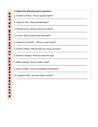 This document contains 20 questions reported in the form of indirect speech. The questions are divided into two sections, with the first 10 questions reporting Wh- questions and the second 10 reporting Yes/No questions. All of the questions provide information about who asked whom the question and what the question was about.