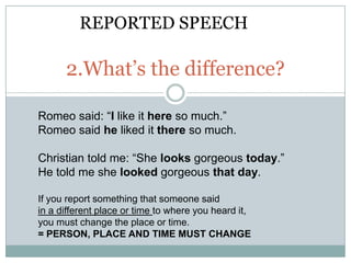 The document discusses the differences between direct and reported speech. It provides examples of how pronouns, places, times, tenses, modal verbs, questions, and imperatives change when moving from direct to reported speech. Specifically, it notes that pronouns, places, times, and verb tenses change to be consistent with the new context when something is reported rather than quoted directly. Modal verbs, questions, and imperatives also take different forms in reported versus direct speech.