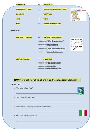 The document discusses the rules for changing direct speech to reported or indirect speech in English. It provides examples of changing verb tenses and expressions like pronouns, adverbs of time and place, and question words when converting direct speech to reported speech. The examples are presented in a question and answer format to illustrate the rules.