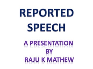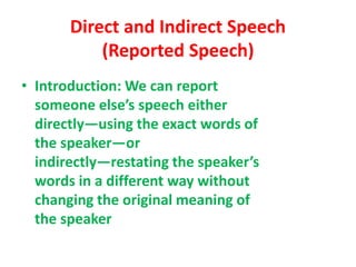 The document discusses direct and indirect speech, also called reported speech. It explains how to change the tense and time/place words when converting direct speech to indirect speech, depending on whether the reporting verb is in the past or present tense. The rules are illustrated with examples, such as changing "I am going" to "I was going" or "today" to "that day". Imperative, interrogative and yes/no questions are also addressed.