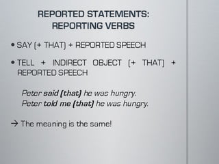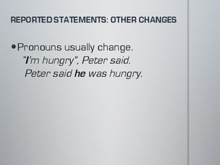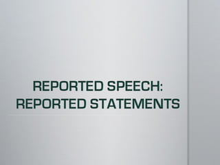 The document provides a comparison of direct and reported speech, listing the changes in verb tenses and other words when moving from quoting someone's exact words to reporting what they said. Direct speech uses present tenses while reported speech changes verbs to past tenses, substitutes pronouns like this/these for that/those, and replaces words like now with then to indicate the speech is being reported after the fact rather than occurring in the present.