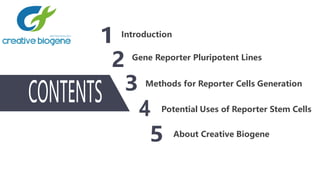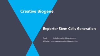 Creative Biogene focuses on the generation of reporter stem cell lines utilizing gene reporter technologies that facilitate the noninvasive tracking of cell differentiation and behavior in regenerative medicine. The document discusses various methods for creating such reporter lines, including minimal promoter-driven reporters and knock-in approaches using advanced genome-editing techniques like CRISPR/Cas9, highlighting the advantages and challenges of each. The potential applications of these reporter stem cells include drug screening, developmental research, and therapeutic implementations, emphasizing the need for efficient differentiation into specialized cells.