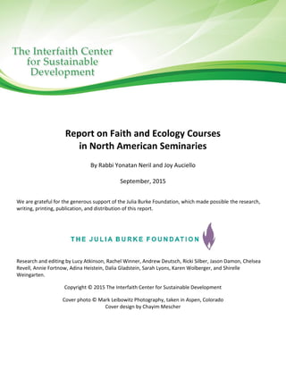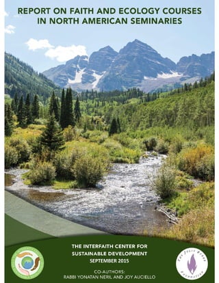This report summarizes the findings of a study of faith and ecology courses offered at North American seminaries. It finds that at least 162 relevant courses have been offered at 52 seminaries in recent years. This represents growth in seminaries increasing education about the environmental crisis based on faith teachings. The report also highlights 25 seminaries with notable faith and ecology curricula and lists 55 seminaries offering related courses. It concludes that improving emerging clergy's ecological awareness can inspire communities and interfaith cooperation on environmental issues.