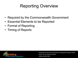 The document outlines the reporting requirements for funds provided by the Australian government under the Building the Education Revolution program. Recipients must submit monthly expenditure reports in a standardized Microsoft Excel format by the third working day of each month. The reports must include project details, jobs supported, spending, facility types and sustainability aspects to remain eligible for further funding.